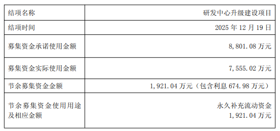 截至本公告披露日,研发中心升级建设项目已建设完成并达到预期可使用状态。该项目的募资实际使用金额为7555.02万元,较承诺使用金额8801.08万元相比有所“瘦身”。