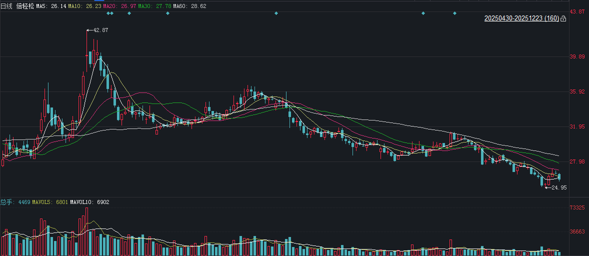 二级市场上,倍轻松上市即巅峰,短暂冲高至131.78元后,股价迅速回落并开始了漫长的下跌过程,最低跌至21元。截至12月23日10点15分,倍轻松下跌1.84%报26.07元/股,今年来公司股价下跌约12%。